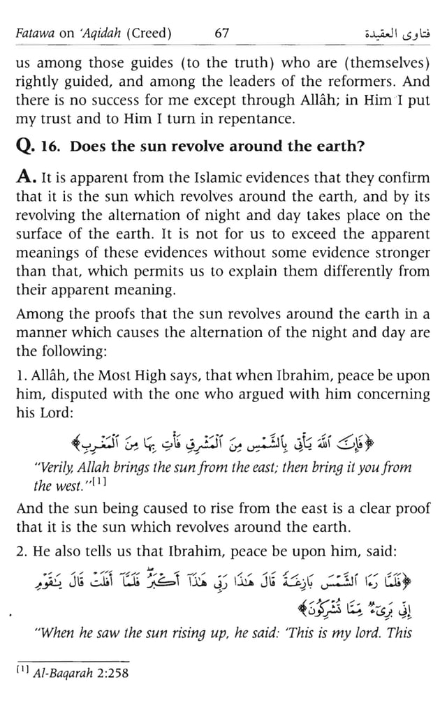 “আল্লাহ তা‘আলা সূর্যকে পূর্ব দিক থেকে উদিত করেন। তুমি পারলে পশ্চিম দিক থেকে উদিত কর।” (সূরা আল-বাকারা, আয়াত: ২৫৮) সূর্য পূর্ব দিক থেকে উঠার মাধ্যমে প্রকাশ্য দলীল পাওয়া যায় যে, সূর্য পৃথিবীর উপর পরিভ্রমণ করে।