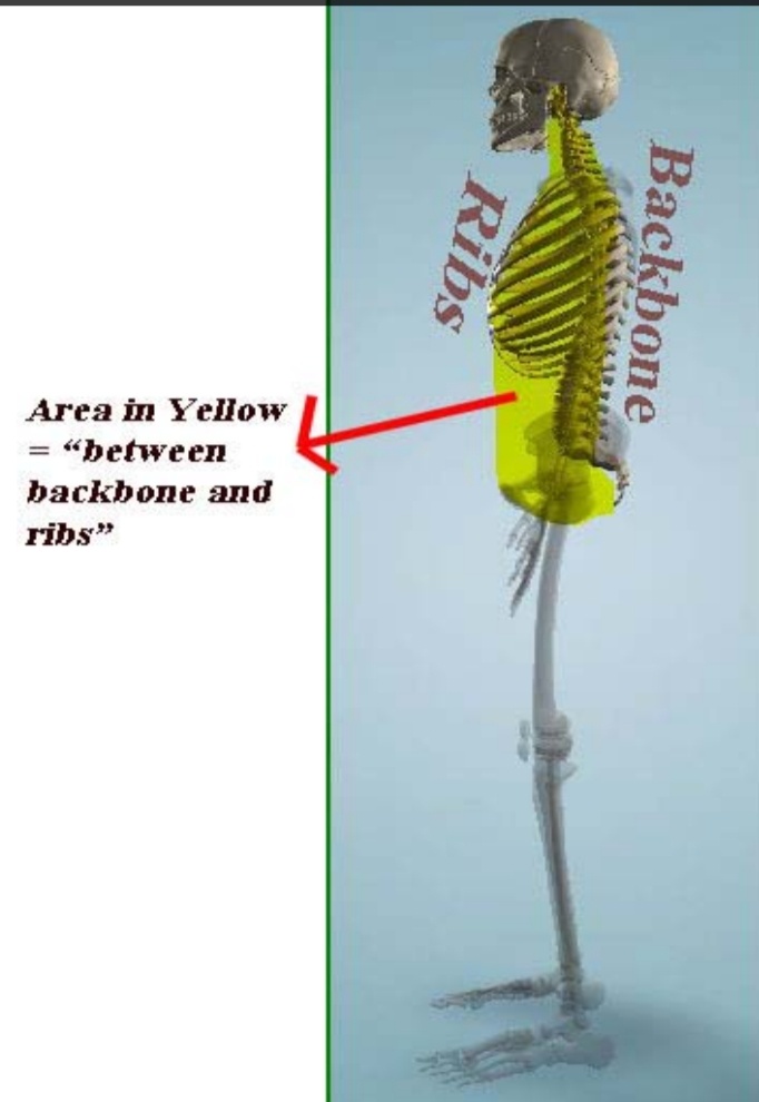এখানে প্রশ্ন এসে যায়, ‘মেরুদণ্ড ও বুকের পাঁজরের মধ্যে’ কথাটি খাড়াভাবে বা উপর থেকে নিচ বরাবর ধরে ব্যাখ্যা করা গ্রহনযোগ্য কিনা। এভাবে ব্যাখ্যা করলে ‘মেরুদণ্ড ও বুকের পাঁজরের মধ্যে’ কথাটি দ্বারা হাত পা ও মাথা বাদে পুরো শরীরেরই ভেতরের অংশকে নির্দেশ করা যাবে। নিচের চিত্রটি দেখুন:
