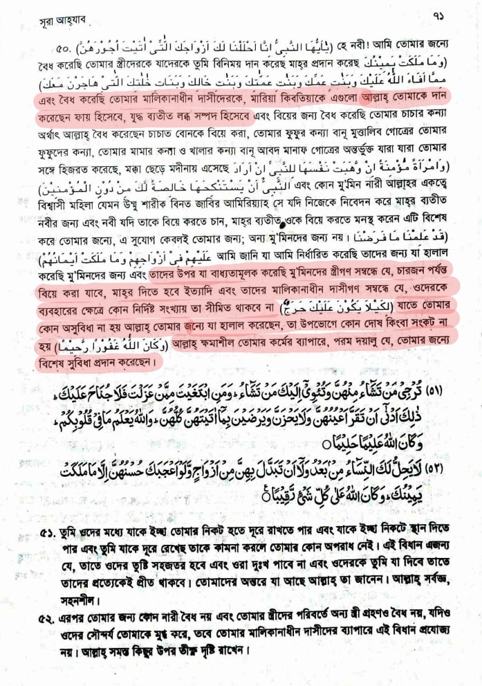 হে নবী! নিশ্চয় আমি তোমার জন্য তোমার স্ত্রীগণকে বৈধ করেছি যাদেরকে তুমি মোহরানা প্রদান করেছ এবং বৈধ করেছি তোমার অধিকারভুক্ত দাসিগণকে যাদেরকে আমি যুদ্ধবন্দিনীরূপে দান করেছি এবং বিবাহের জন্য বৈধ করেছি তোমার চাচাতো ভগিনী, ফুফাতো ভগিনী, মামাতো ভগিনী ও খালাতো ভগিনীকে; যারা তোমার সঙ্গে দেশ ত্যাগ করেছে এবং কোন বিশ্বাসীনী নবীর নিকট নিজেকে নিবেদন করলে এবং নবী তাকে বিবাহ করতে চাইলে (সেও তোমার জন্য বৈধ।) –এ (বিধান) বিশেষ করে তোমারই জন্য; অন্য বিশ্বাসীদের জন্য নয়; বিশ্বাসীদের স্ত্রী এবং তাদের দাসিগণ সম্বন্ধে যা নির্ধারিত করেছি তা আমি জানি। (এ বিধান এ জন্য) যাতে তোমার কোন অসুবিধা না হয়। আর আল্লাহ ক্ষমাশীল, পরম দয়ালু।