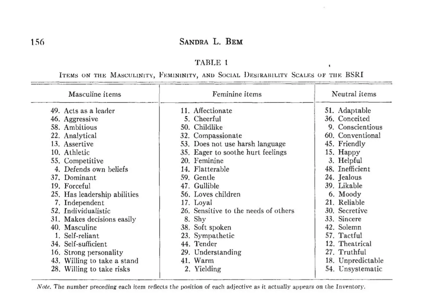 “তদনুসারে, পুরুষত্ব এবং নারীত্বের স্কেলগুলির জন্য আইটেম নির্বাচনের প্রাথমিক হিসাবে, প্রায় ২০০টি ব্যক্তিত্বের বৈশিষ্ট্যগুলির একটি তালিকা সংকলন করা হয়েছিল যা লেখক এবং বেশ কয়েকজন ছাত্রের কাছে মূল্যের দিক থেকে ইতিবাচক এবং যা স্বরে পুংলিঙ্গ বা মেয়েলি বলে মনে হয়েছিল। এই তালিকাটি সেই ভান্ডার হিসাবে কাজ করেছিল যেখান থেকে পুরুষ এবং মেয়েলি বৈশিষ্ট্যগুলি চূড়ান্তভাবে বেছে নেওয়া হয়েছিল।” [32]