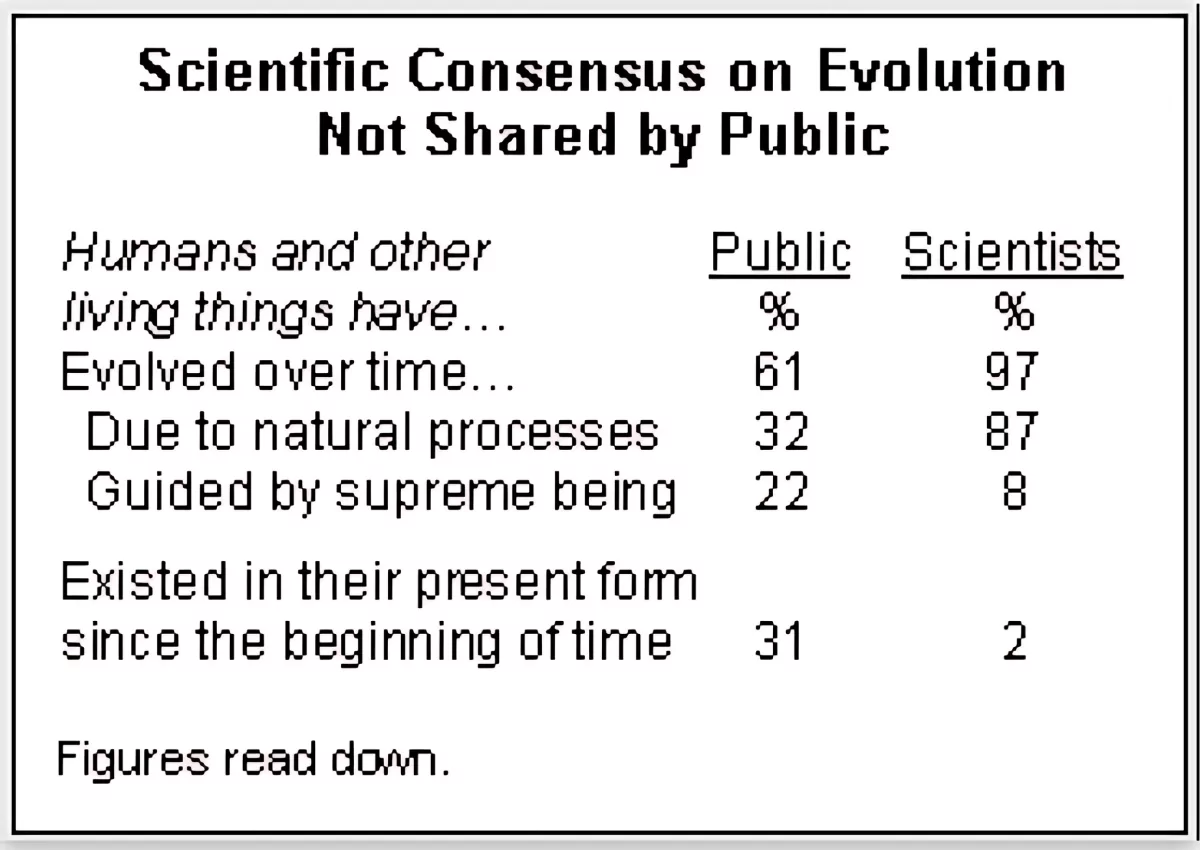 বর্তমানে জীববিজ্ঞান এবং প্রাণের উৎস নিয়ে গবেষণাকারীদের মধ্যে বর্তমানে সৃষ্টিবাদীদের খুঁজে পাওয়া কঠিন। ৪,৮০,০০০ জন জীববিজ্ঞানীদের উপর চালানো জরিপে মাত্র ৭০০ জন সৃষ্টিবাদী পাওয়া গেছে যা প্রায় নগণ্য। সুতরাং বুঝতেই পারছেন যে বেশিরভাগ বা অনেক বিজ্ঞানী বিবর্তনে বিশ্বাস করে না কথাটি মিথ্যা। বিবর্তনবাদ আজকের পৃথিবীতে নিউটনের মহাকর্ষ তত্ত্ব, আইনস্টাইনের আপেক্ষিকতার তত্ত্ব ও কোপার্নিকাসের সৌরকেন্দ্রিক তত্ত্বের মতই একটি প্রতিষ্ঠিত তত্ত্ব। কে কি বিশ্বাস করে না করে তার উপর তো আর সত্য নির্ভর করে না। যেমন কেউ তো আর মহাকর্ষ তত্ত্বে বিশ্বাস না করে ছাঁদ থেকে লাফ মারছে না। তেমনিভাবে কোন বিজ্ঞানী ব্যক্তিগতভাবে বিবর্তনবাদ ভুল মনে করতেই পারেন। হোক তা ধর্মীয় অন্ধবিশ্বাস বা অন্য কোনো কারণ কিন্তু তা গ্রহণযোগ্য সত্য হবে তখনই যখন তিনি তার স্বপক্ষে প্রমান পেশ করতে পারবেন। যা আজ পর্যন্ত কোন বিজ্ঞানী পারেননি। নিচে পিউ রিসার্চ সেন্টারের একটি জরিপ দেখানো হচ্ছে, যেখানে ৯৭% বিজ্ঞানীই বিবর্তনতত্ত্বকে মেনে নিয়েছে বলে জানা যাচ্ছে, [1]