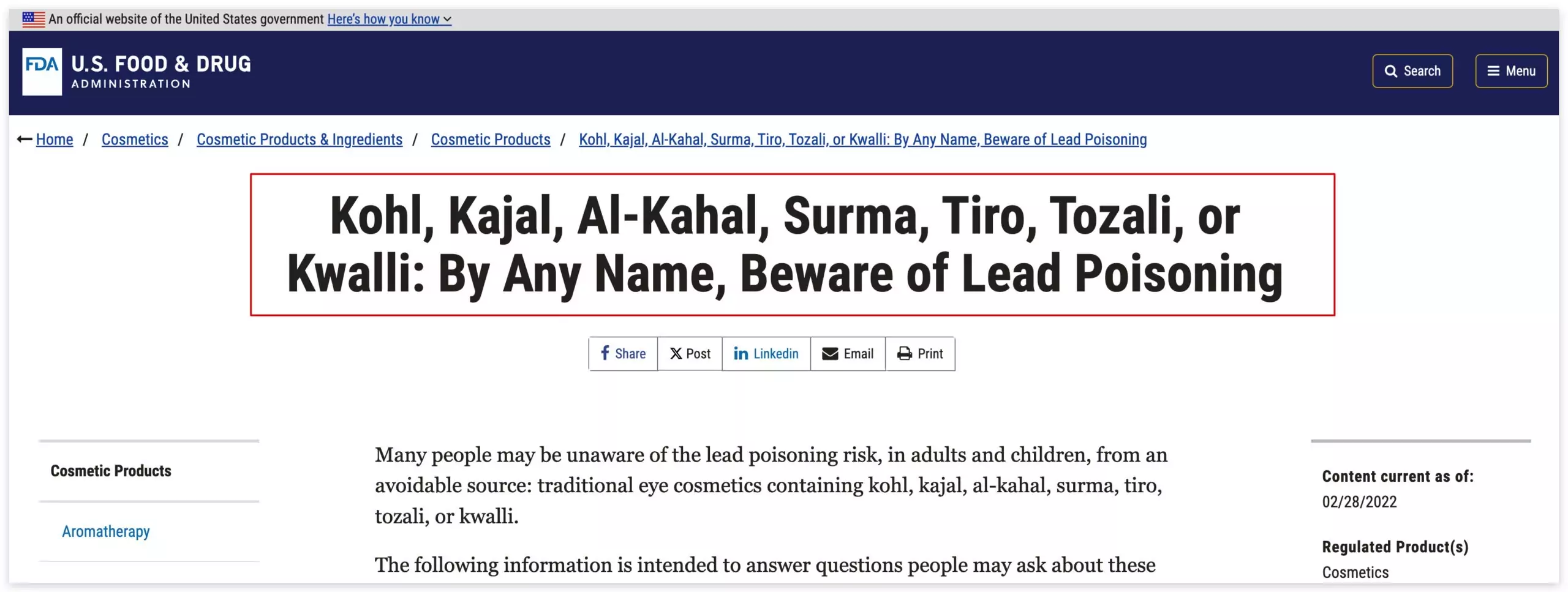 - “Kohl, Kajal, Al-Kahal, Surma, Tiro, Tozali, or Kwalli: By Any Name, Beware of Lead Poisoning”. Food and Drug Administration. Retrieved 2017-10-26. ↩︎